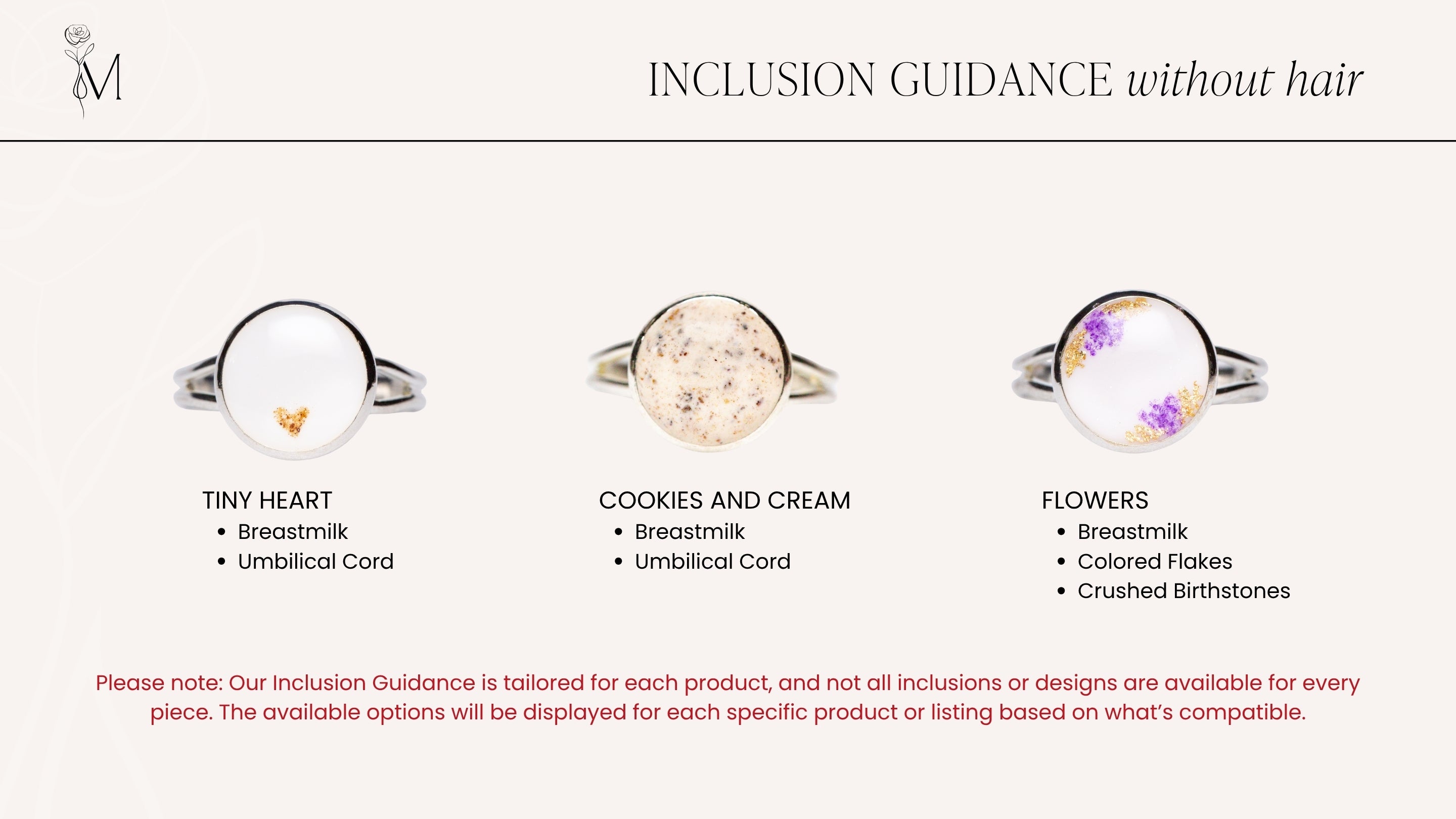 Inclusions are the meaningful materials you send us to incorporate into your keepsake—like breastmilk, ashes, hair, umbilical cord, placenta, or dried florals. These are what make each piece deeply personal and one-of-a-kind.