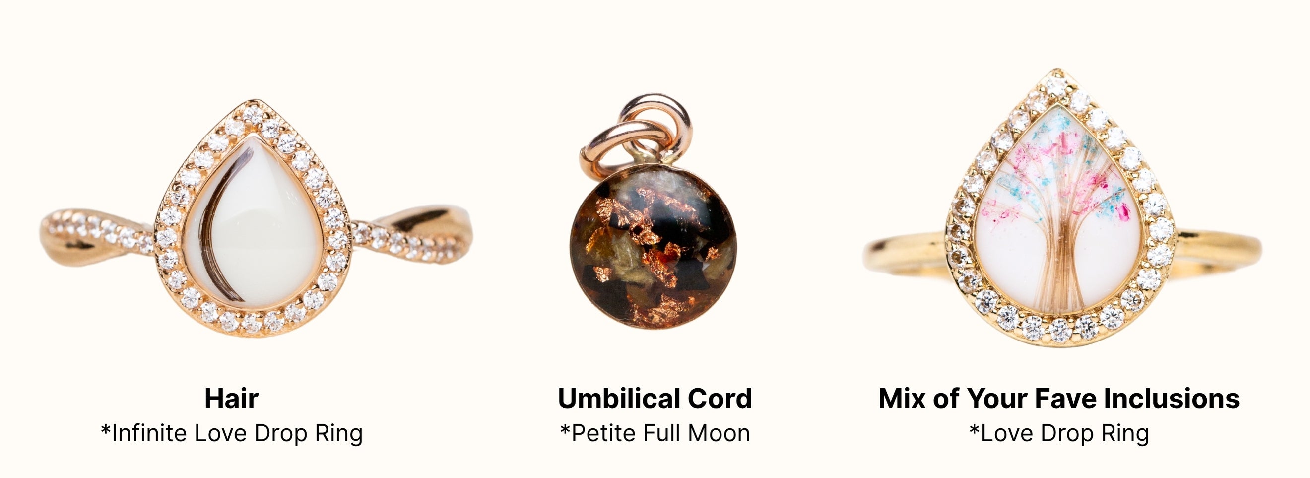 Inclusions are the physical pieces of your story—like breastmilk, ashes, hair, umbilical cord, placenta, or dried florals—that we carefully preserve inside your keepsake. Each one holds meaning, and no two are ever the same. It’s what makes your piece truly yours.